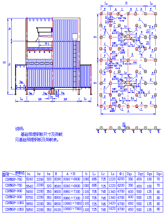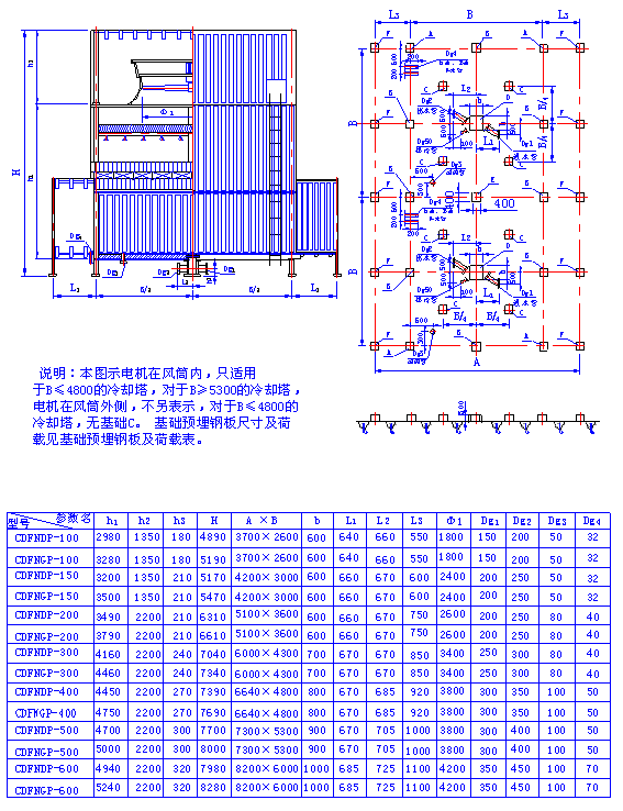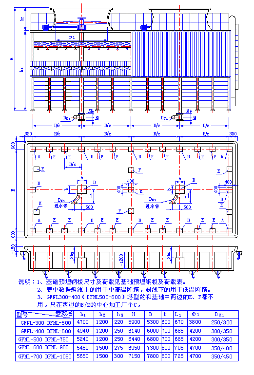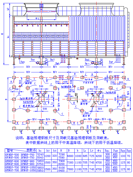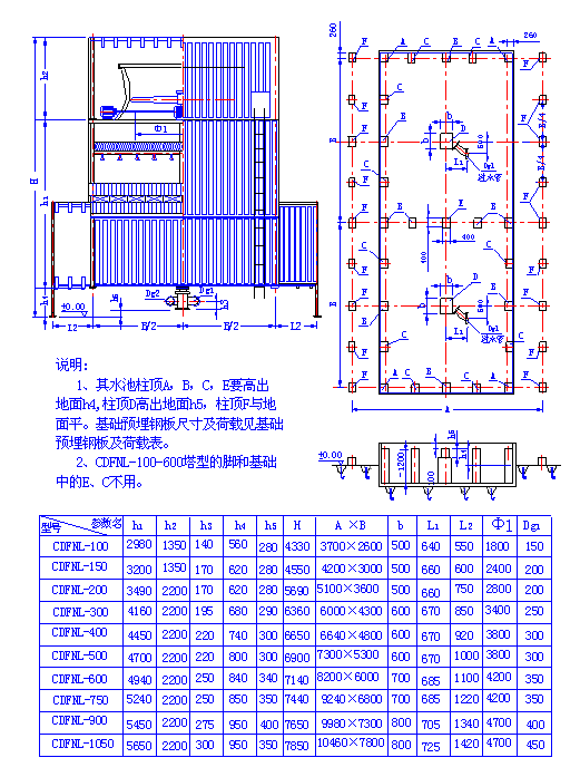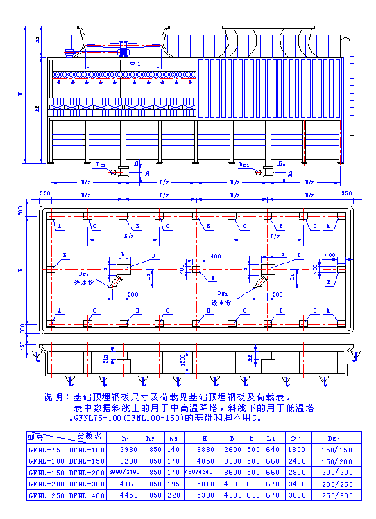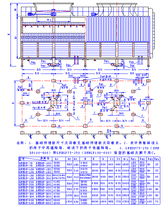 (二)、超低噪聲方形逆流式玻璃鋼冷卻塔 1、CDFNL-100~1050立面及基礎圖 2、CDFNDP-100~600 CDFNGP-100~600型立面及基礎圖 3、CDFNDP-100~600 CDFNGP-100~600型立面及基礎 4、CDFN系列超低噪聲方形逆流式玻璃鋼冷卻塔主要參數表