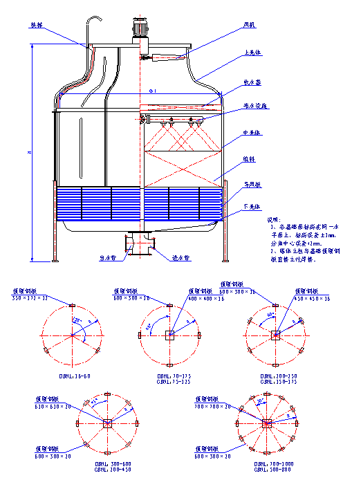 1、噪聲為標(biāo)準(zhǔn)點D測定值,即距屏蔽冷卻塔遠,距基礎(chǔ)1.5米高。 2、本系列標(biāo)準(zhǔn)設(shè)計工況濕球溫度τ=28℃,進水溫度過t1=37℃,出水溫度t2=32℃,即水溫降△t=5℃,逼近度t2-τ=4℃ 3、本表中列出τ=28℃時,△t=5℃及8℃,t2=32℃和τ=27℃,△t=5℃及8℃,t2=32℃的冷卻水量供選用時參考,其它參數(shù)的冷卻水量請查熱力性能曲線。 4、進水壓力指接管點處水壓。 3、DBNL3系列低噪聲逆流式玻璃鋼冷卻塔 4 、GBNL3系列工業(yè)型逆流式玻璃鋼冷卻 5、DBNL3系列低噪聲逆流式玻璃鋼冷卻塔主要參數(shù)表